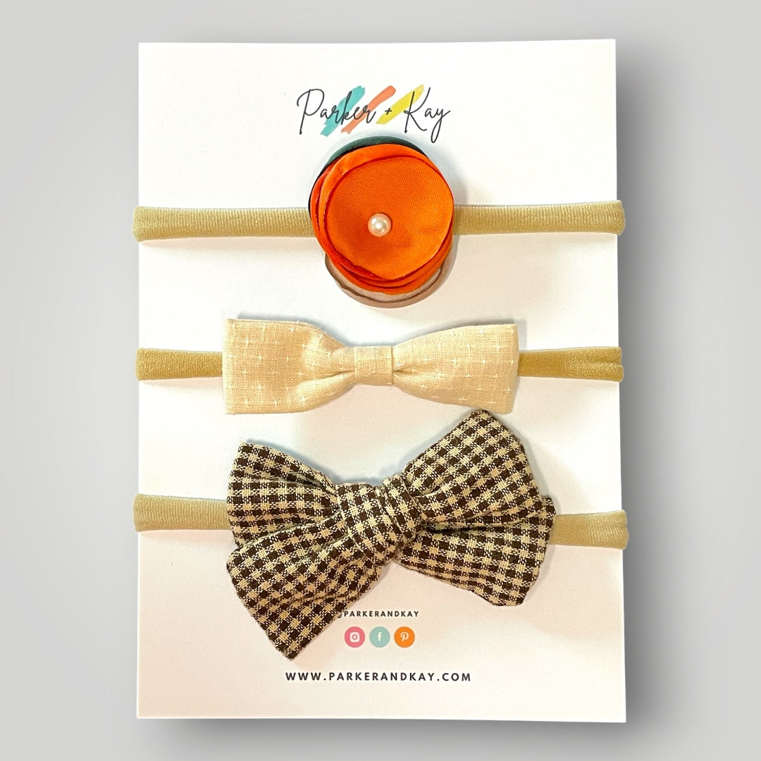 Curated set of bows attached to nude nylon headbands. Stretchy nylon grows with the baby, offering easy wear and won't slip off baby's head. Bows are approximately 2.5-4" x 1.5-3" depending on the set.