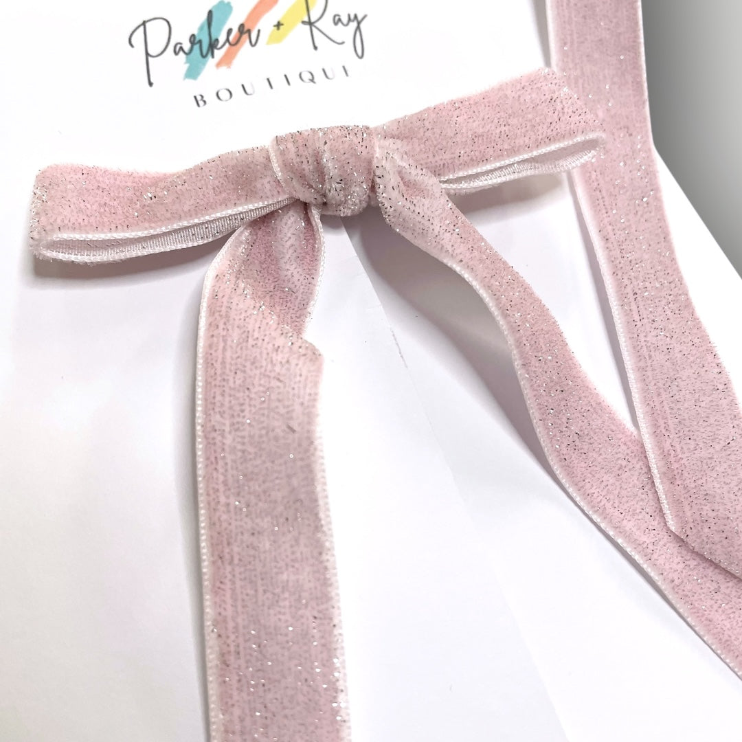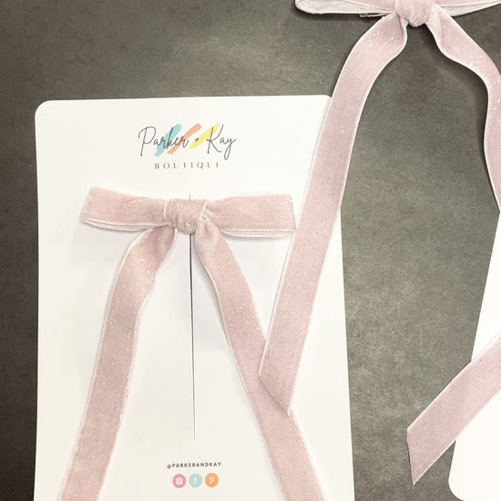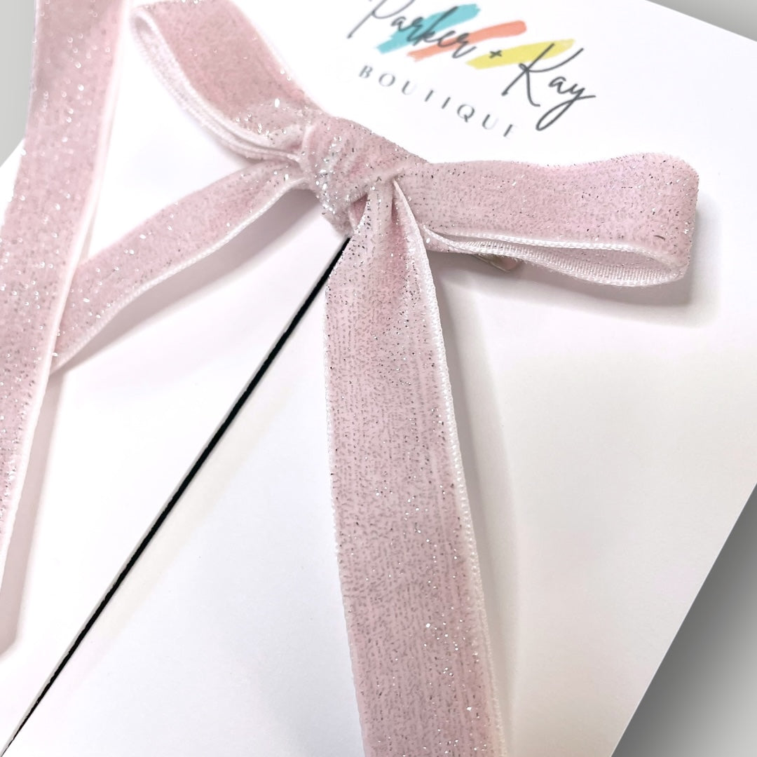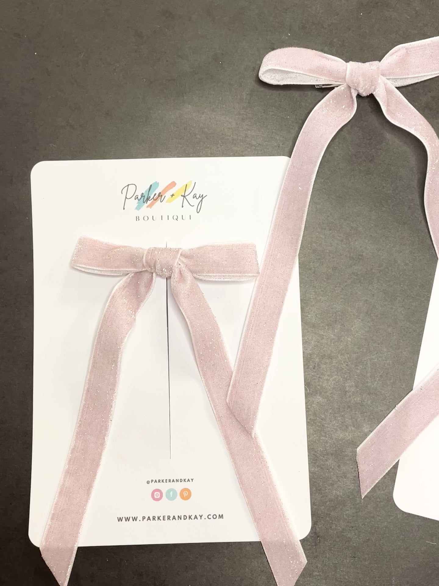 Sparkling soft long tail velvet bow featured on an alligator clip. Bows are approximately 3.5” wide with 6” tails and are available in three beautiful colors.