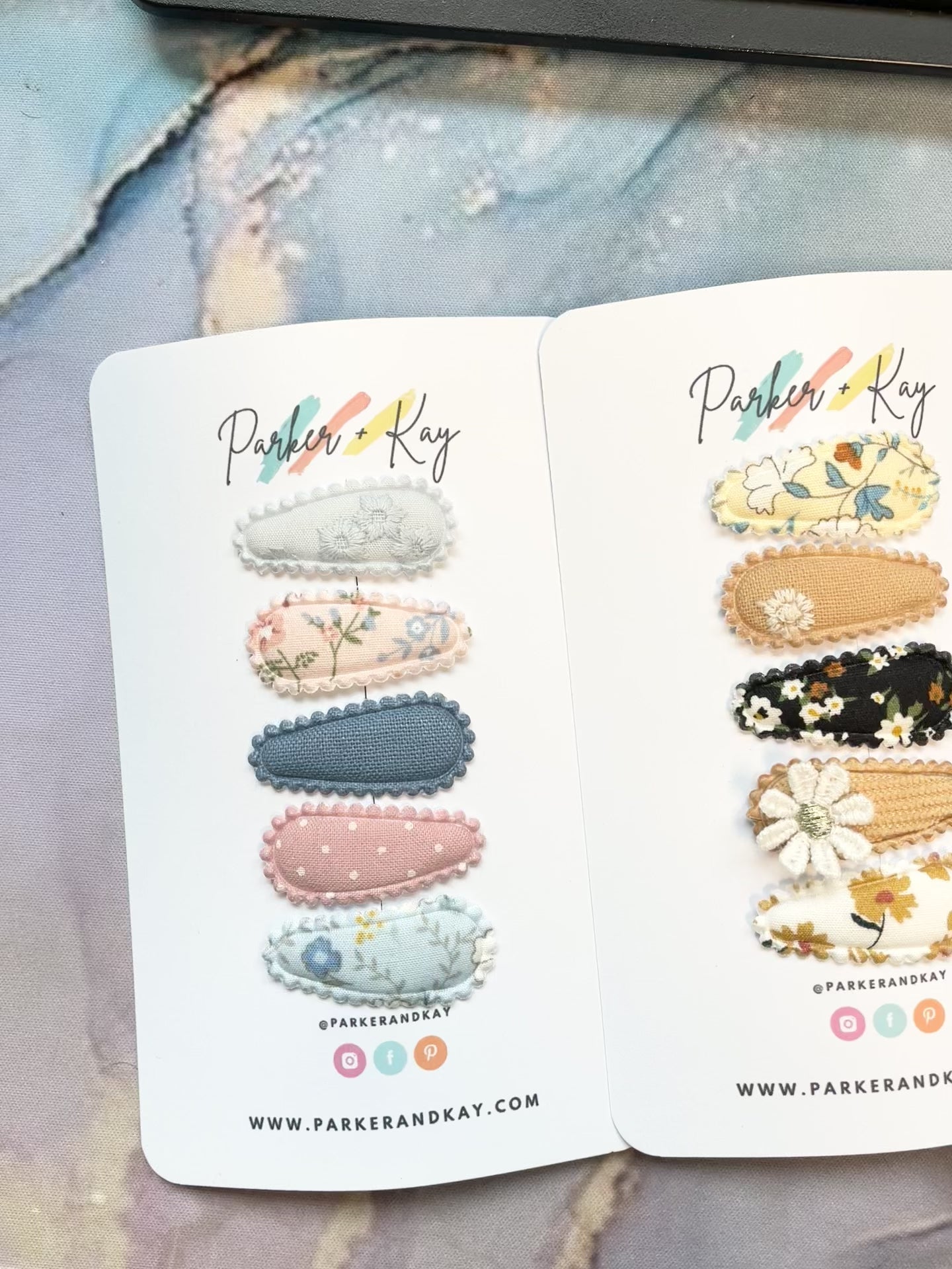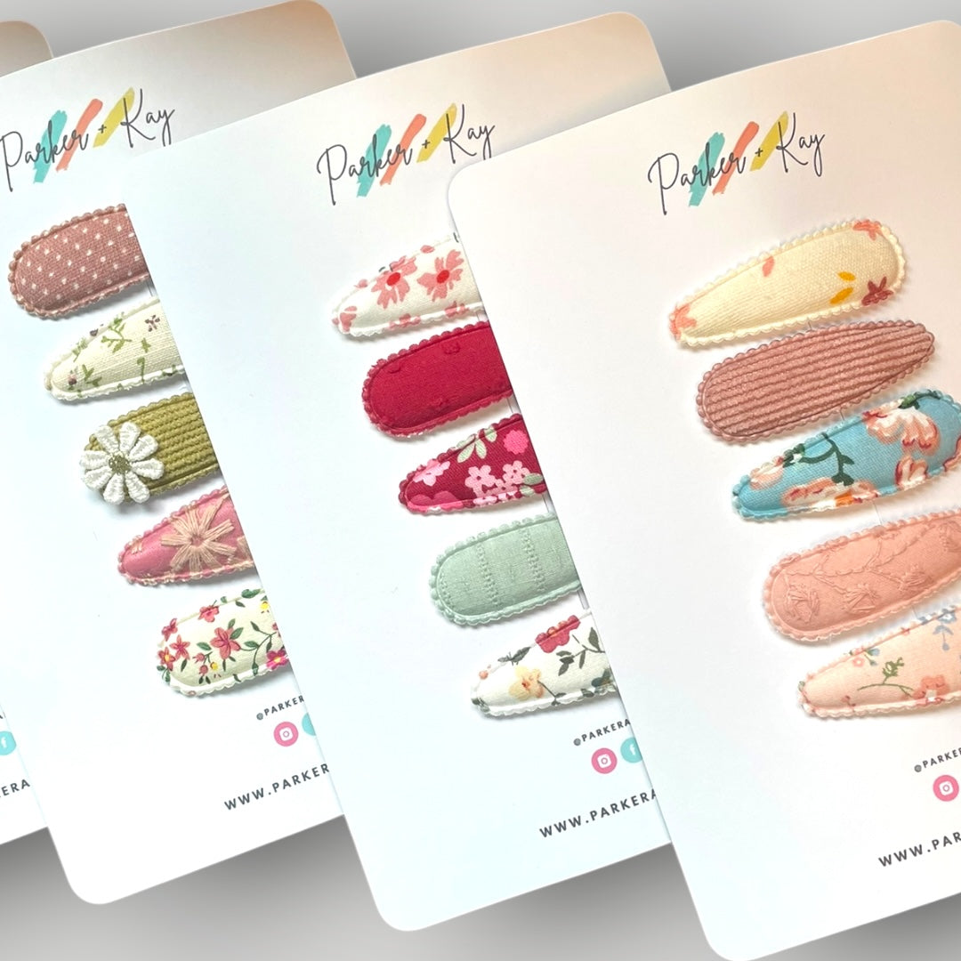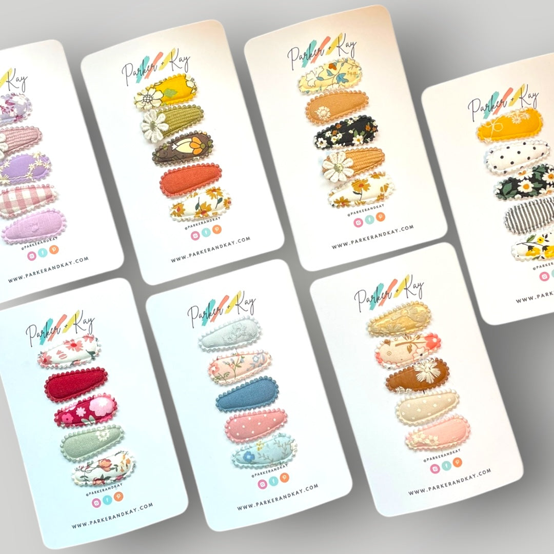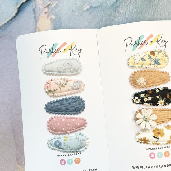Set includes a range of different accessories - some from past collections, some never released, as well as some from upcoming collections. In this set, you will receive five different fabric snap clips in your choice of mini (~1"x 0.25") or standard size (~2"x0.5").