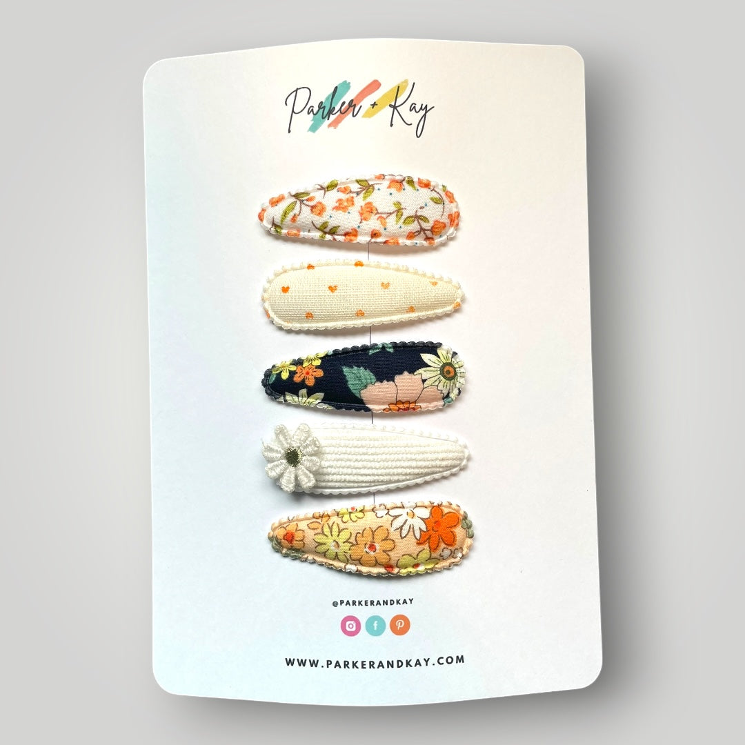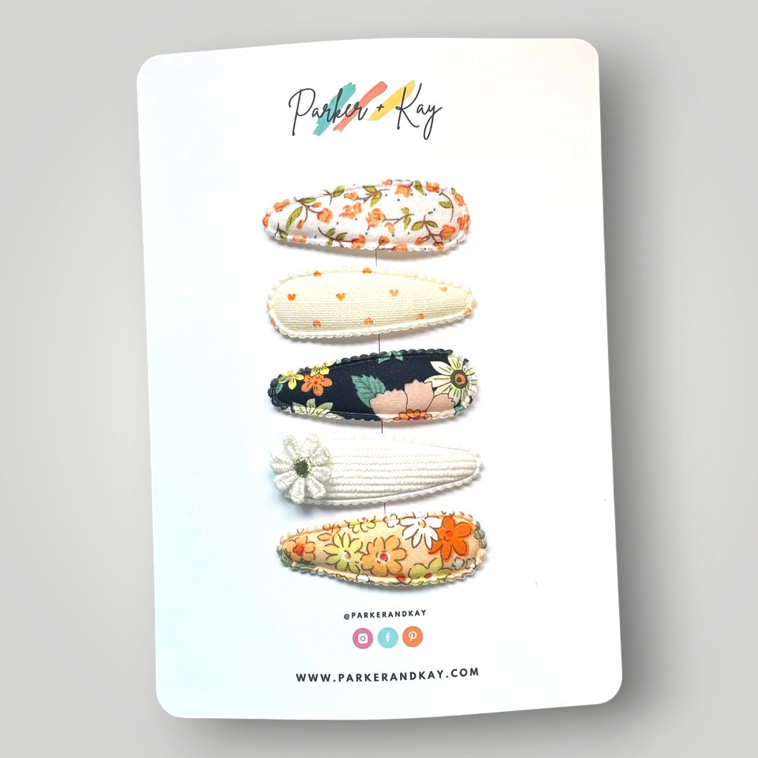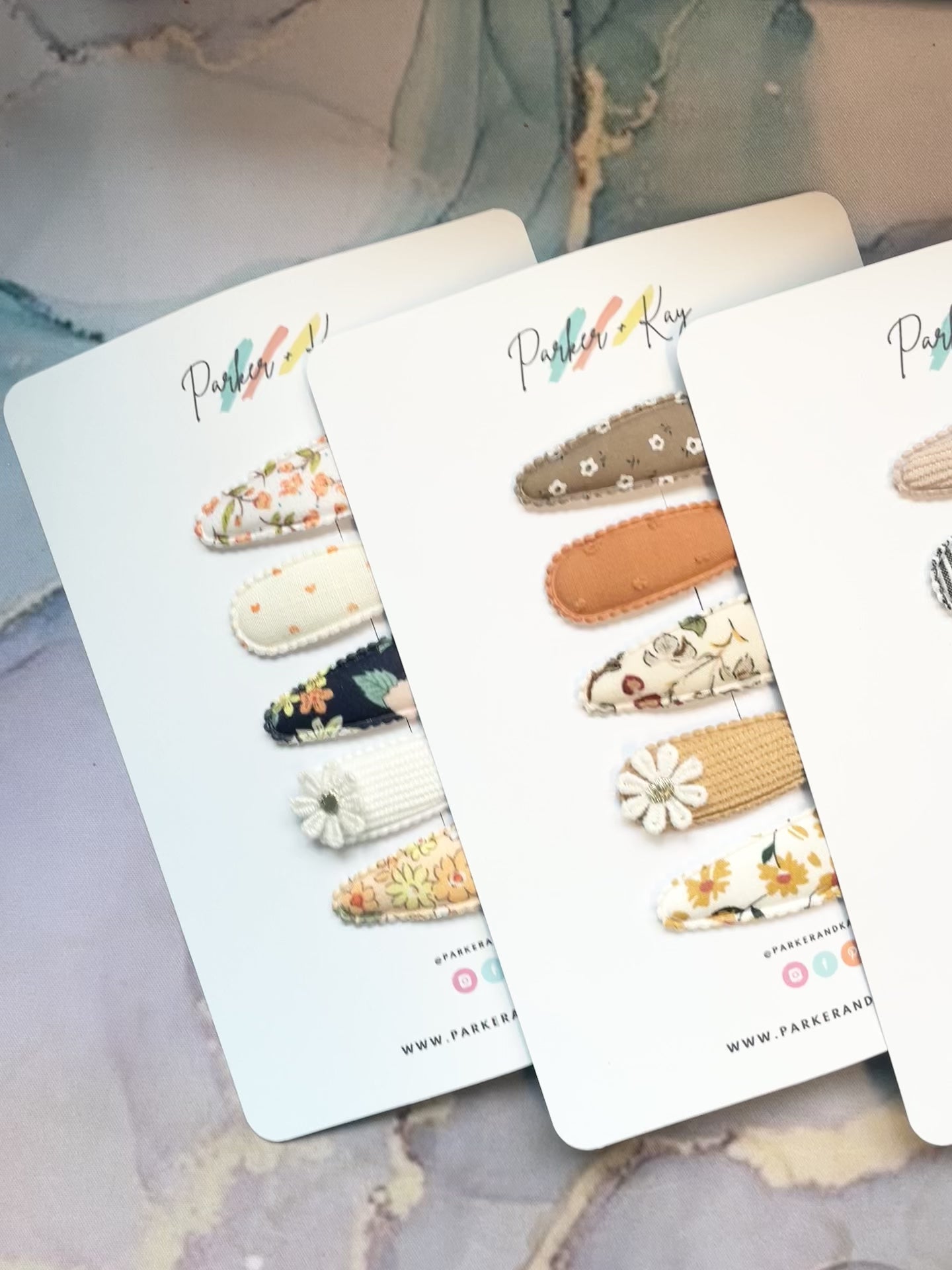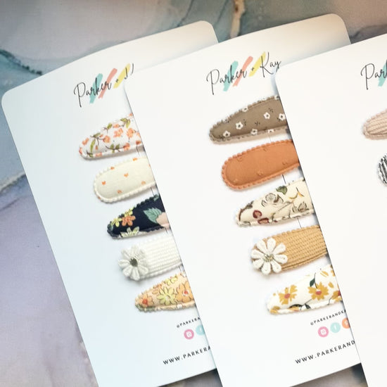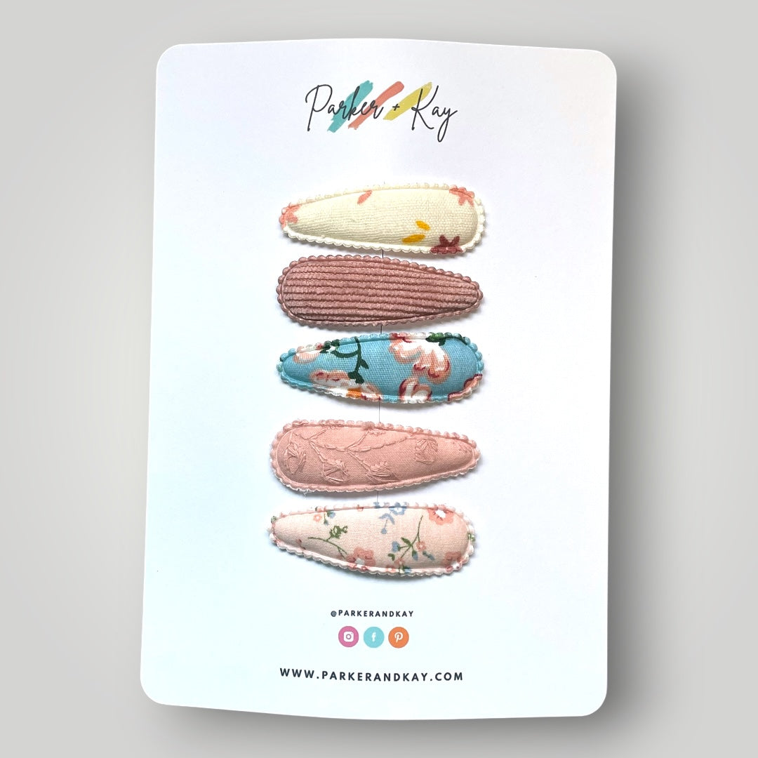 Set includes a range of different accessories - some from past collections, some never released, as well as some from upcoming collections. In this set, you will receive five different fabric snap clips in your choice of mini (~1"x 0.25") or standard size (~2"x0.5").
