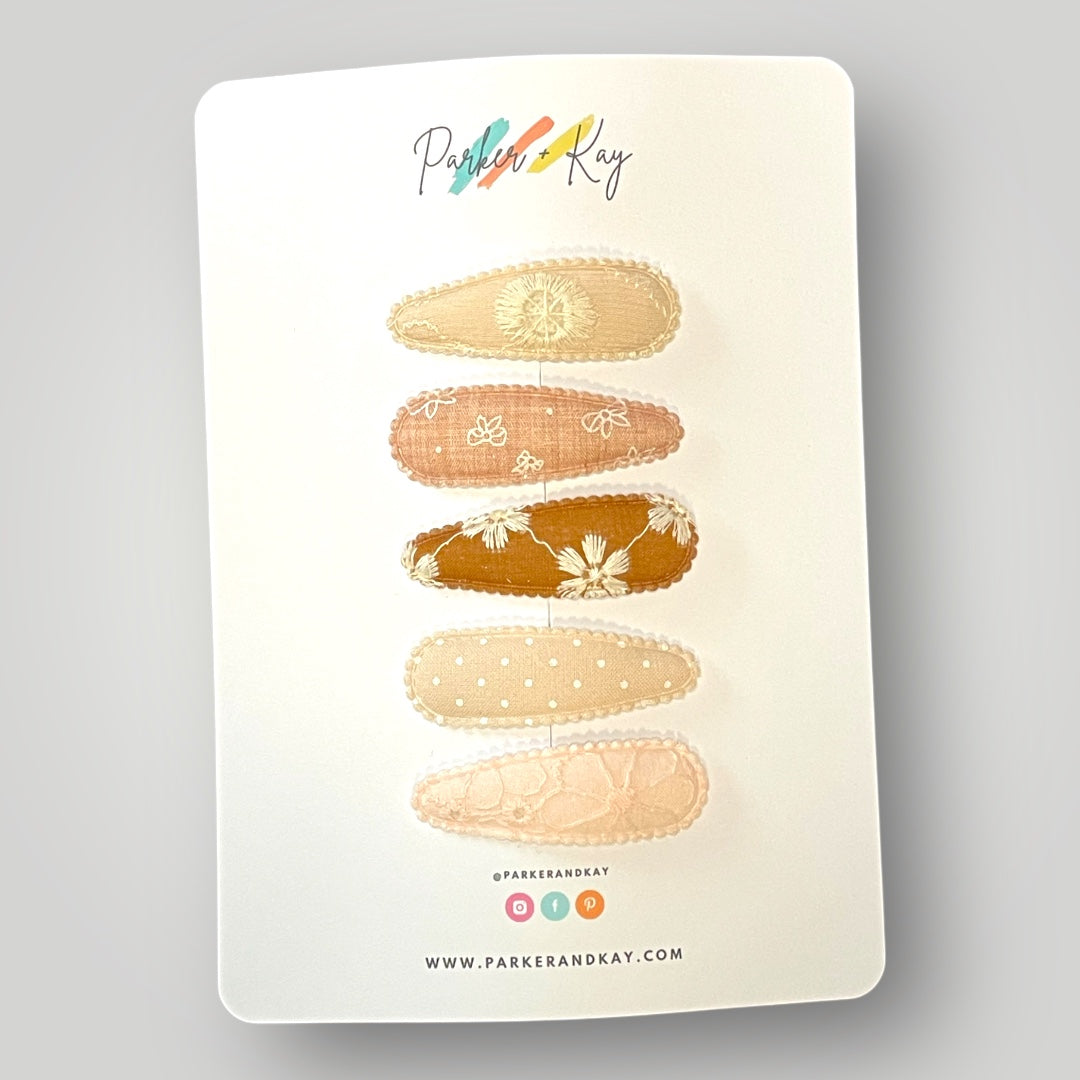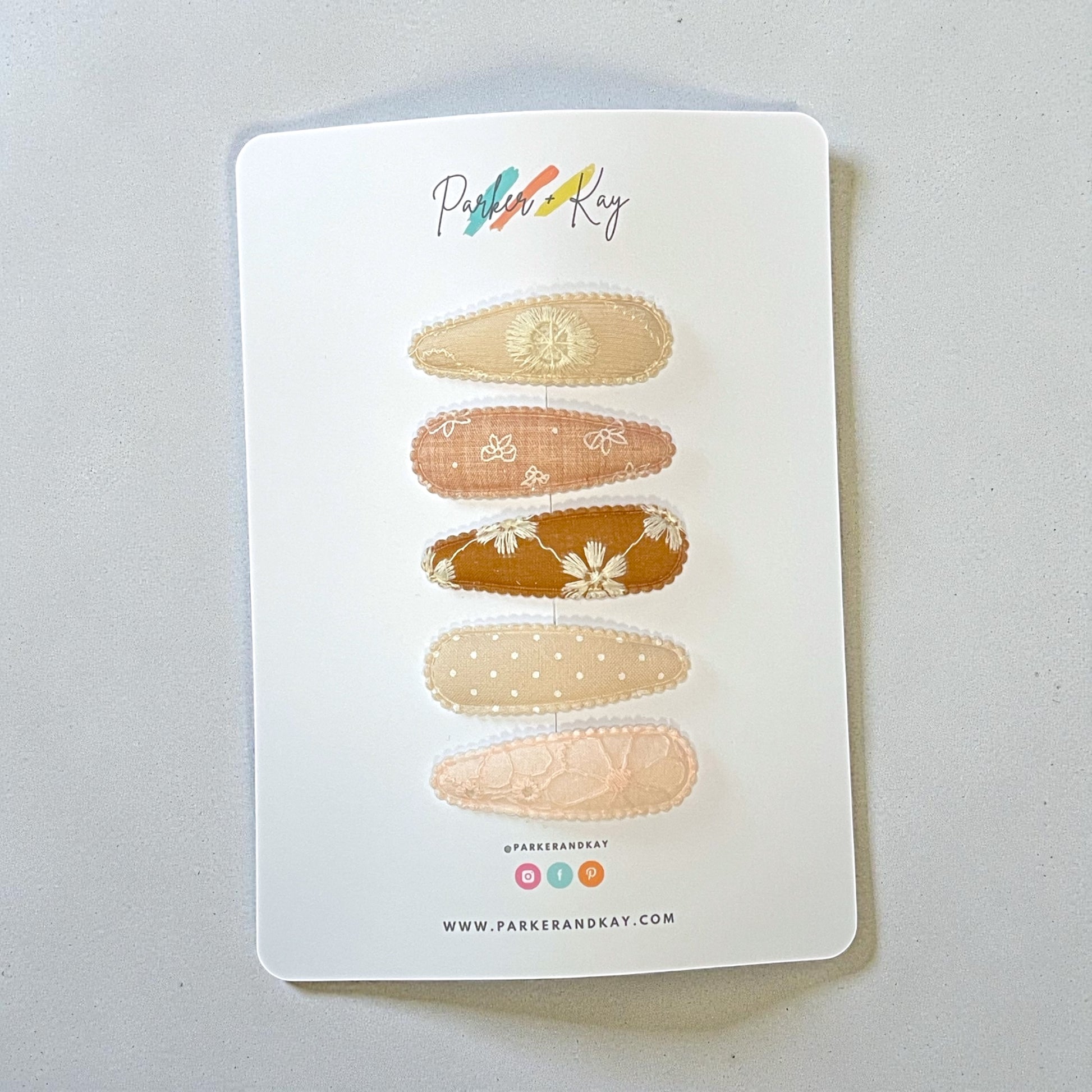 Curated set of fabric covered snap clips that are approximately 2"x0.5".