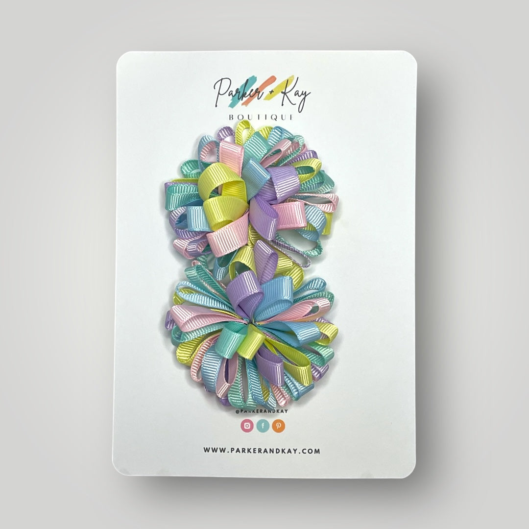Grosgrain ribbon pom poms attached to a metal alligator clip. Clips come in a set of two, making them perfect for pigtails. Pom poms are approximately 2.5” round.