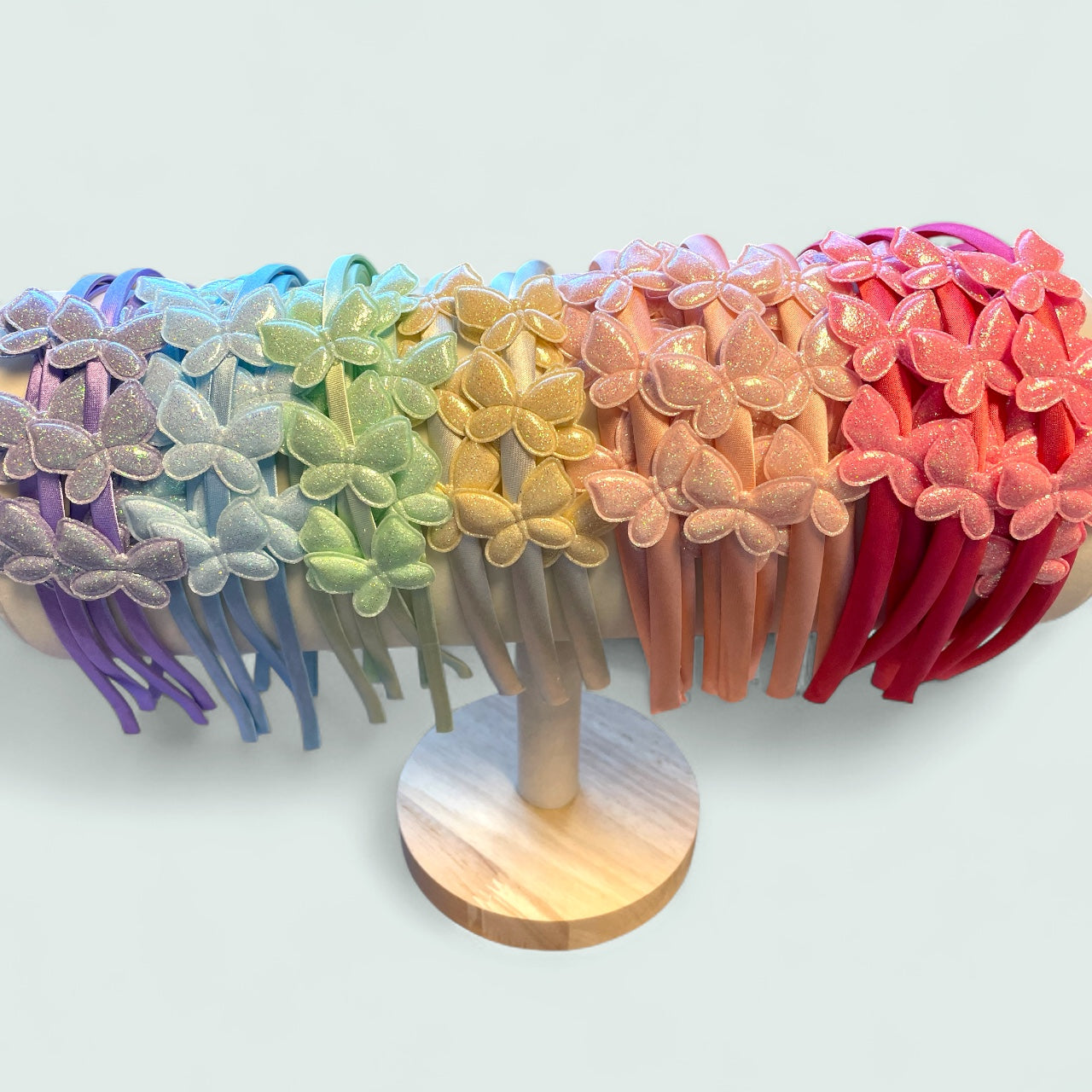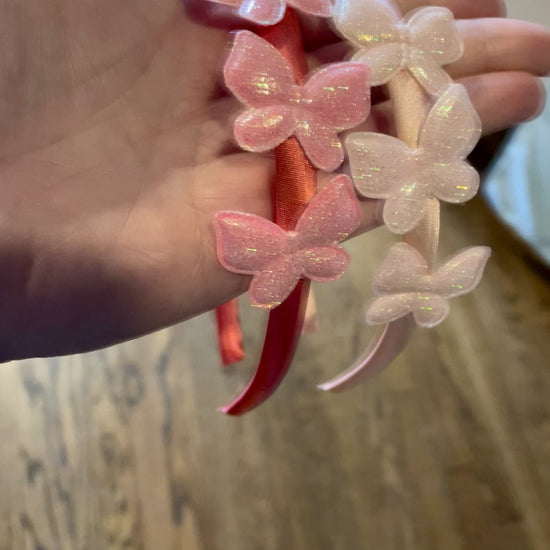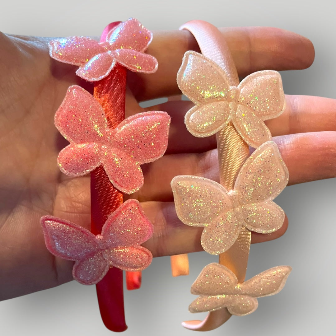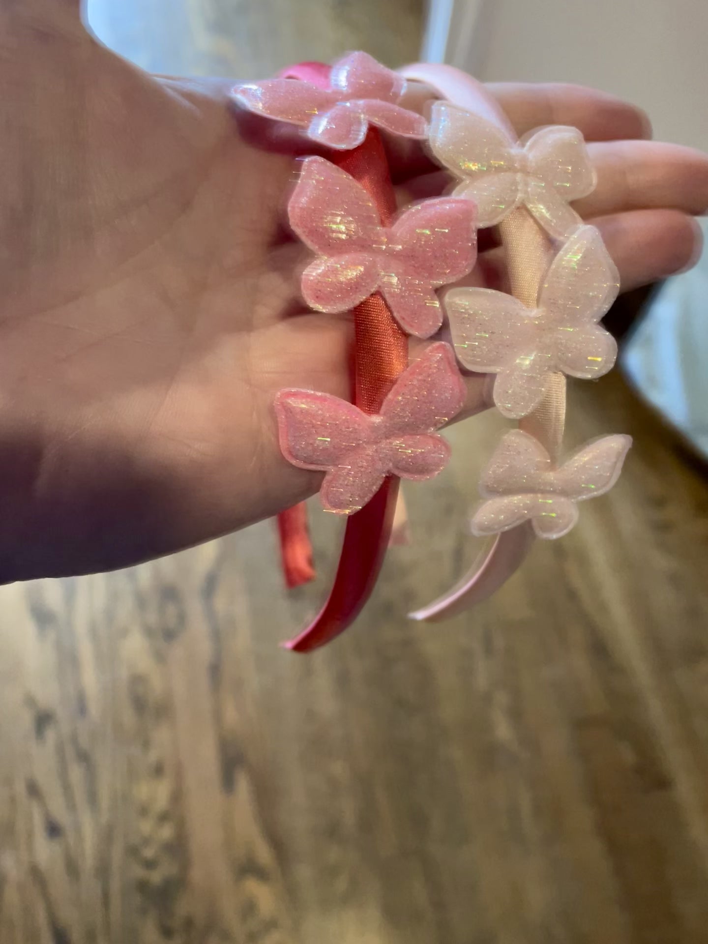 Satin-covered skinny headband with three shimmering butterflies on one side. The opening of the headband is approximately 5”.