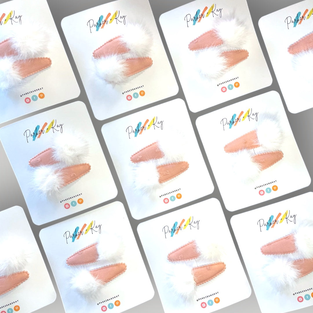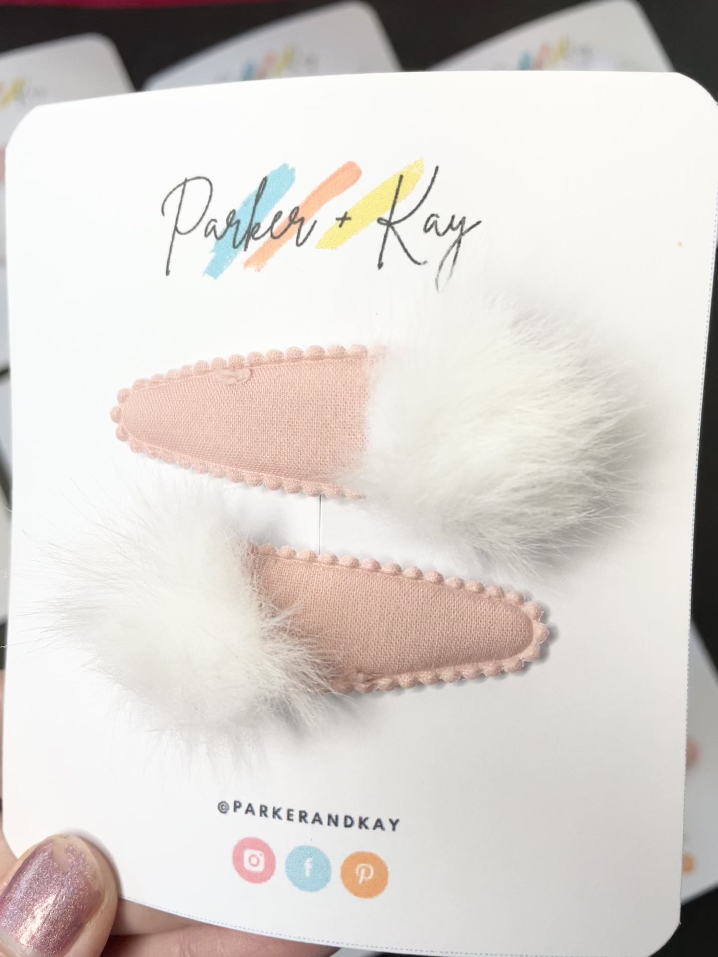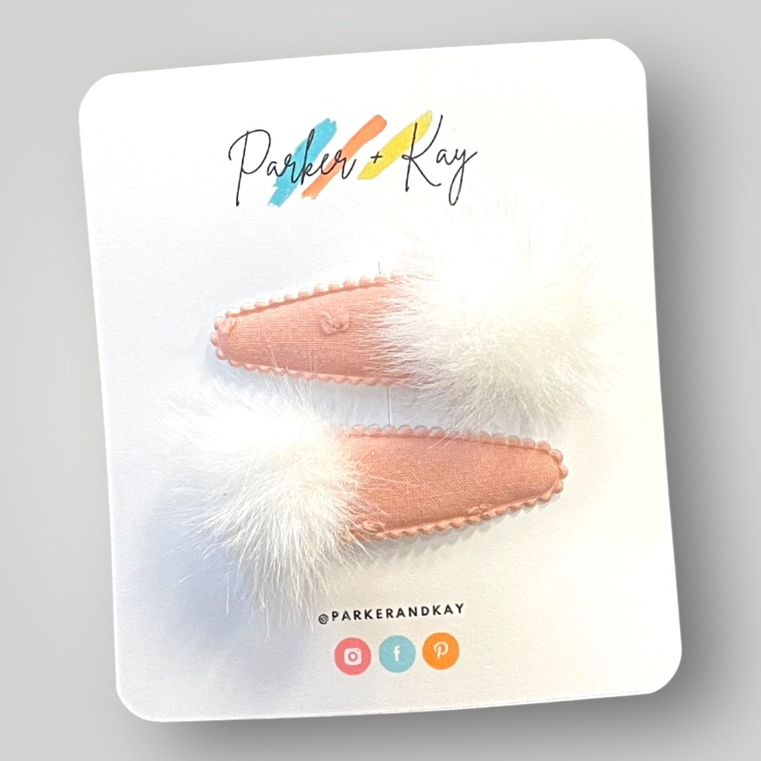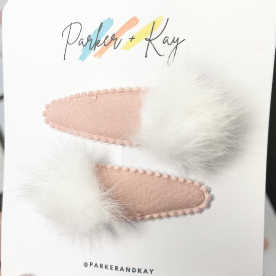 Fluffy faux fur featured on a dusty pink fabric-covered snap clip. Clips are approximately 2"x 1" and come in a set of two clips.