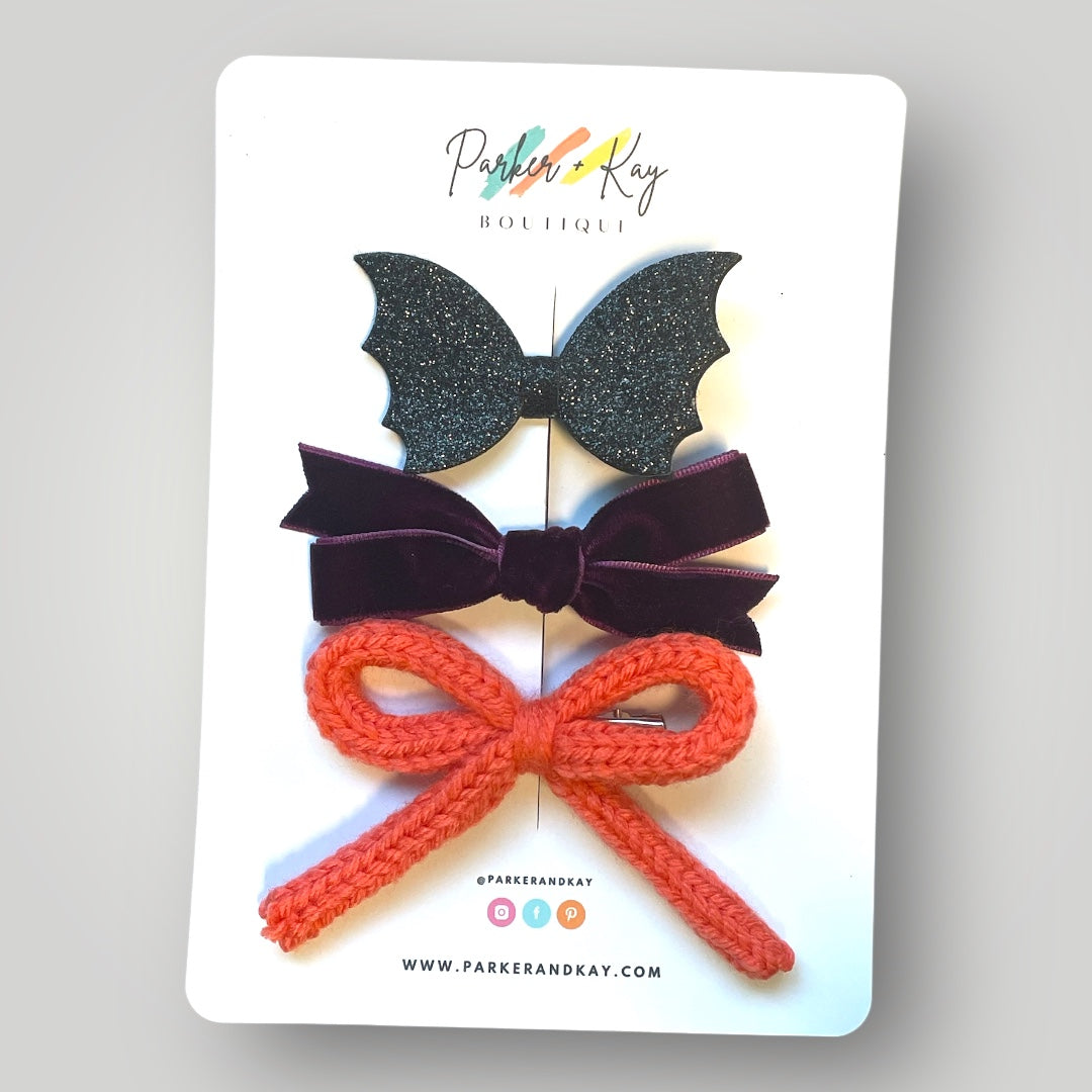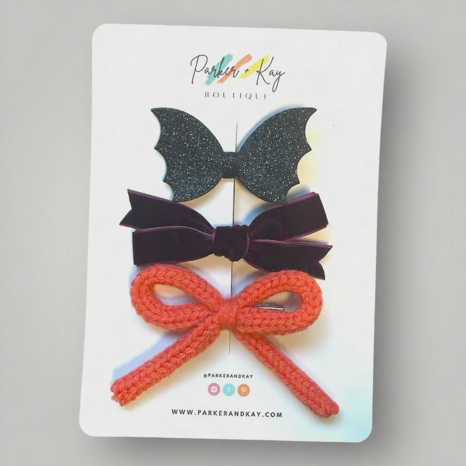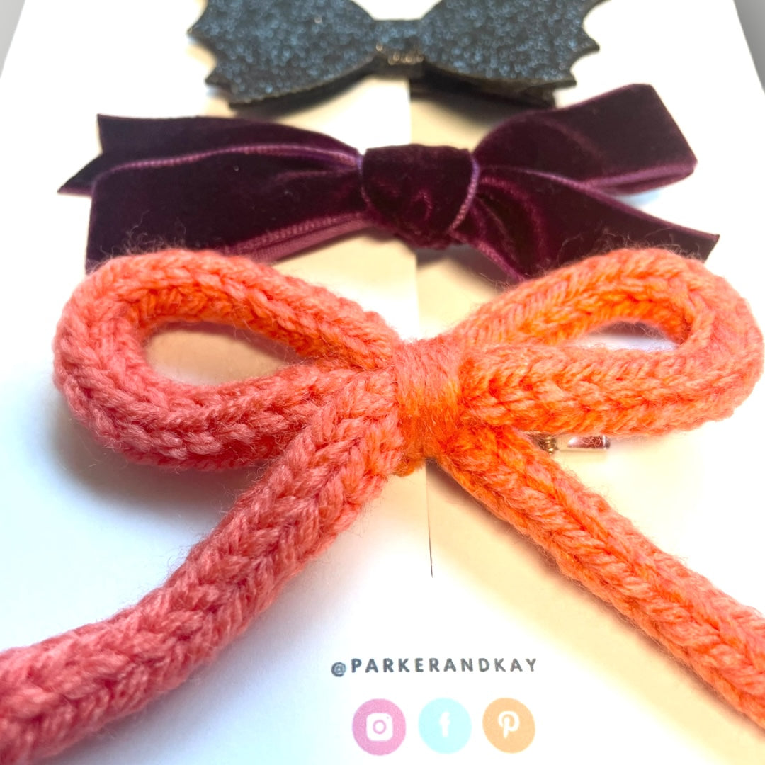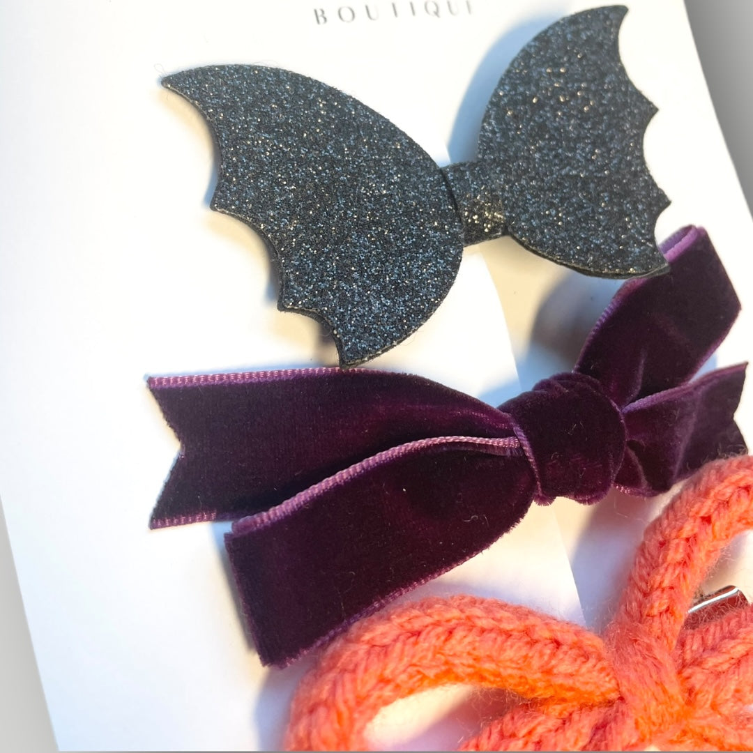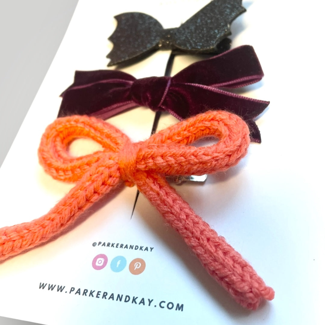 Knit bow clip, velvet bow clip and sparkling faux leather bat clip. Bows are approximately 3.5” and clips are approximately 2”.