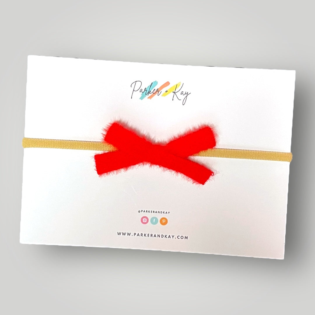 Simple cashmere bow attached to a nylon headband or alligator clips. The stretchy nylon headband will stay in place and grow with baby. Clips are appropriate for any age.