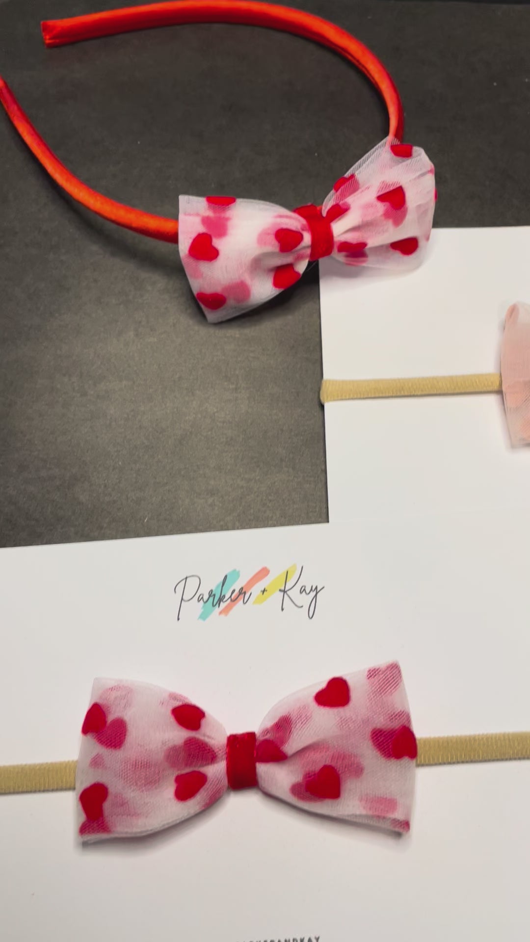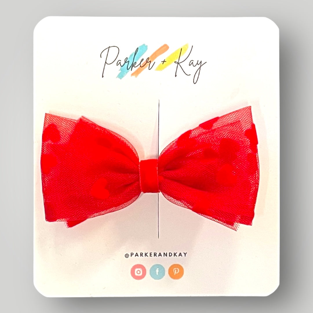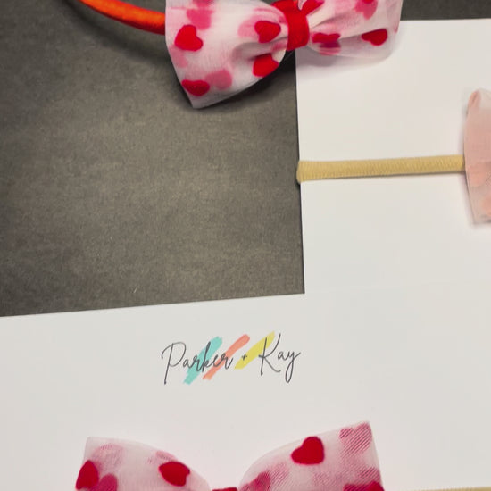 The perfect touch for Valentine's Day or any day, our Sweetheart Bow features a tulle and velvet bow attached to a nylon headband or alligator clip. The bow is also available in a clip/convertible satin headband option, which allows the bow to be worn as a clip or headband by attaching the clip to the headband.