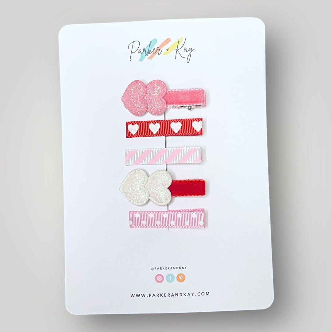 The loveliest little hair clip set you'll find. This set includes a variety of five alligator clips, all fully-lined with grosgrain or velvet ribbon and perfecting for adding a touch of LOVE to your little one's hair. Clips are available in small (~1") or medium (~2").