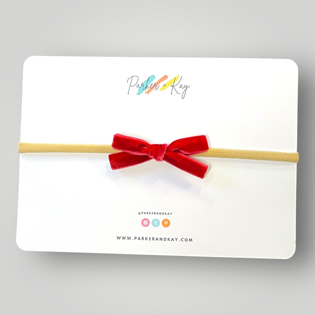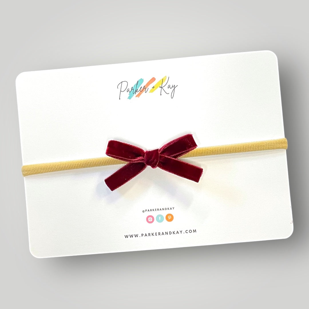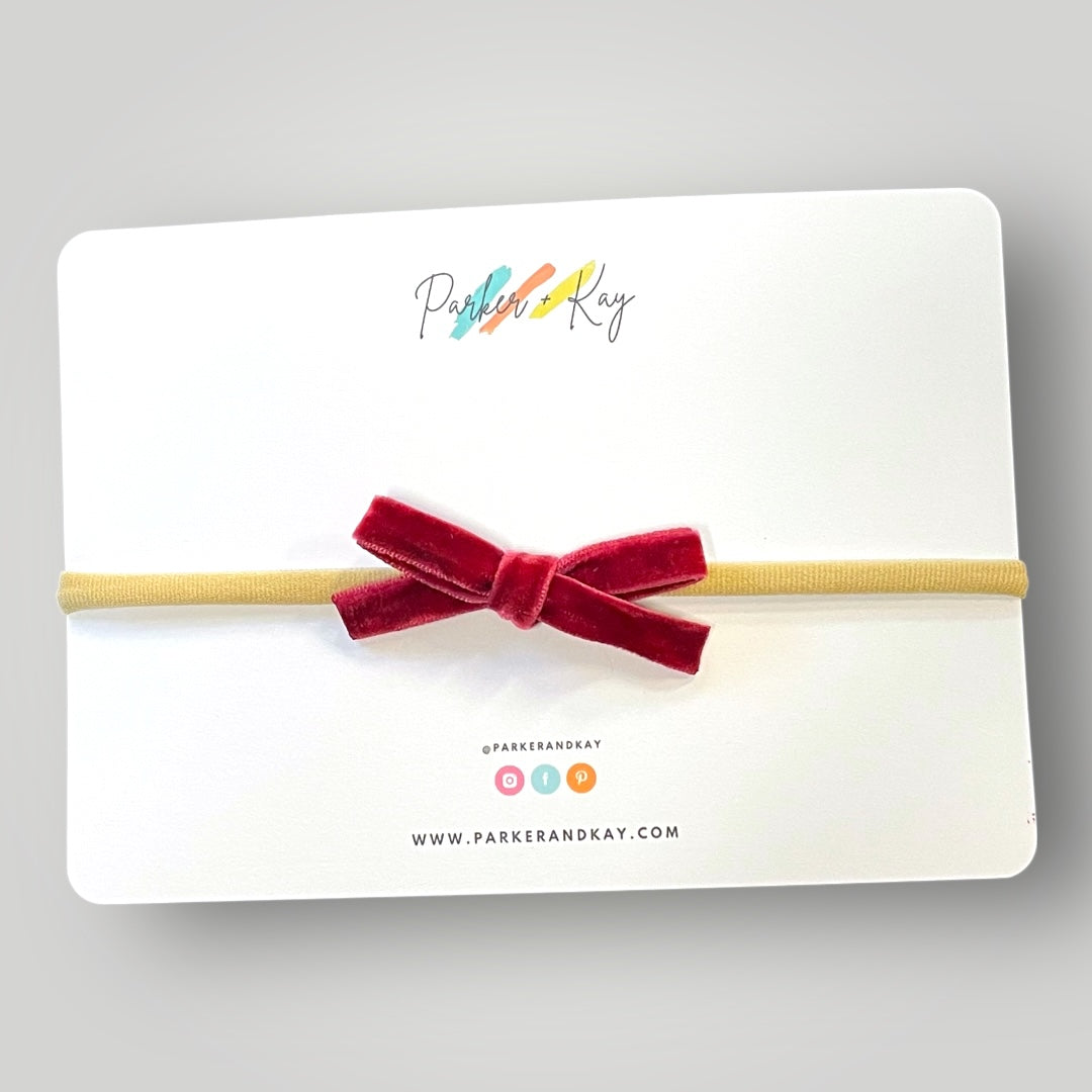 Elegant and dainty double-faced velvet bow presented on a nylon headband. The stretchy nylon headband will stay in place and grow with baby. The bow is approximately 2" wide.